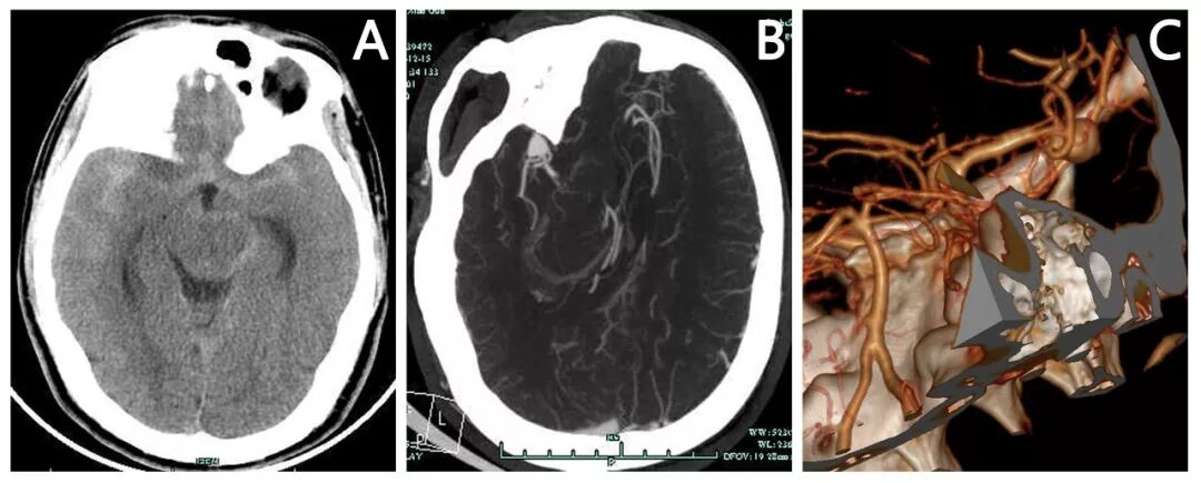 图4. 患者入院后行头颅CT和CTA检查结果提示右侧大脑中动脉瘤。(A)术前头颅CT平扫提示双侧侧裂池,鞍上池,环池,纵裂池蛛网膜下腔出血;(B)术前头颅CTA增强原始片提示右侧侧裂池团状异常高密度影;(C)术前头颅CTA三维重建片提示右侧大脑中动脉分叉部(主干和颞前动脉分叉部)大动脉瘤(约10mm)。