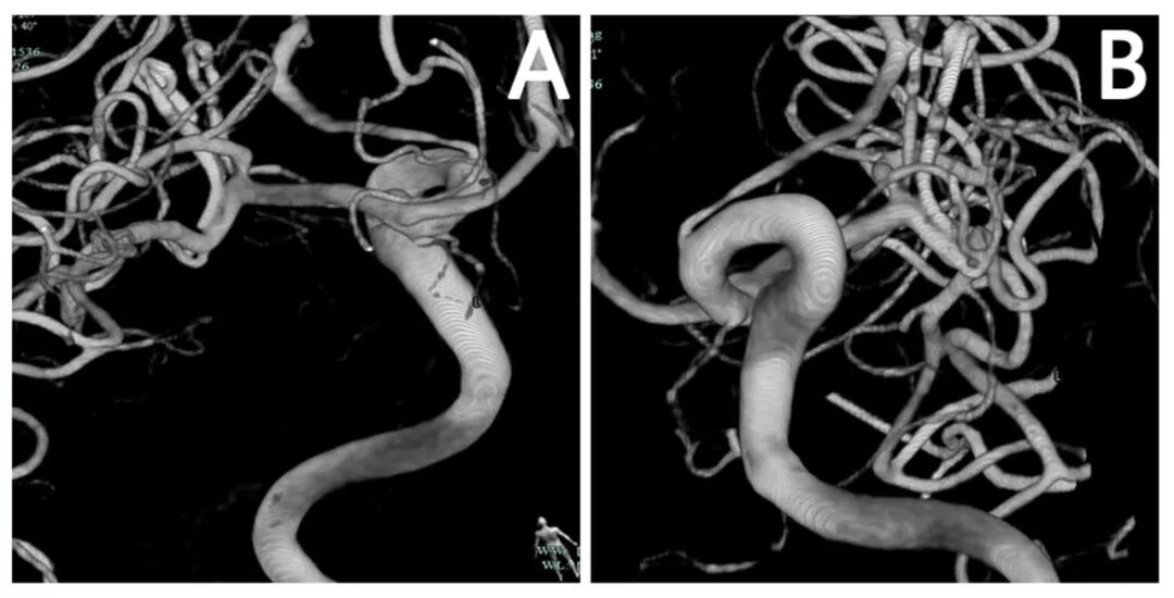 患者术后神志意识清楚,头痛较术前明显好转,四肢肌力及活动良好,头部切口愈合良好。术后复查头颅CT提示局部未见缺血梗塞及挫伤出血灶。术后3月我院复查全脑DSA提示动脉瘤夹闭完全,未见残留复发,载瘤血管及各分支血管通畅(图3A,B)。