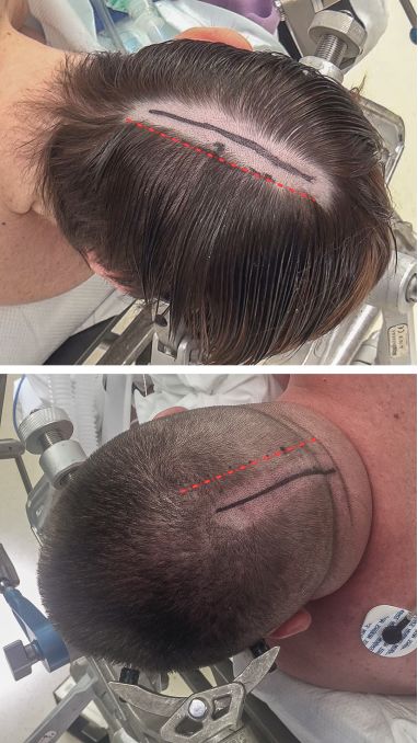 图3. 图示各种手术切口(直线和马蹄形)。旁正中横向(红线)或纵向(平行于上矢状窦,见下文)切口可以提供充足的暴露。马蹄形切口(蓝线)通常用于较大的凸面脑膜瘤或胶质瘤(见上图)。该切口始于上项线,斜向上跨过中线,于人字点转向外侧,向下到达星点。这个切口通常用于大的枕部病变、经天幕入路切除松果体区病变以及小脑天幕面的病变(下图)。颅骨切开轮廓已画出(黑色线)。使用神经导航和术前磁共振静脉成像/血管造影来确定开颅骨窗的位置。