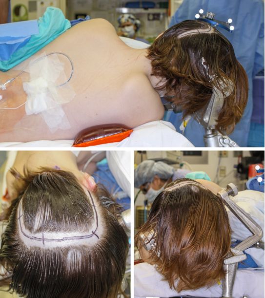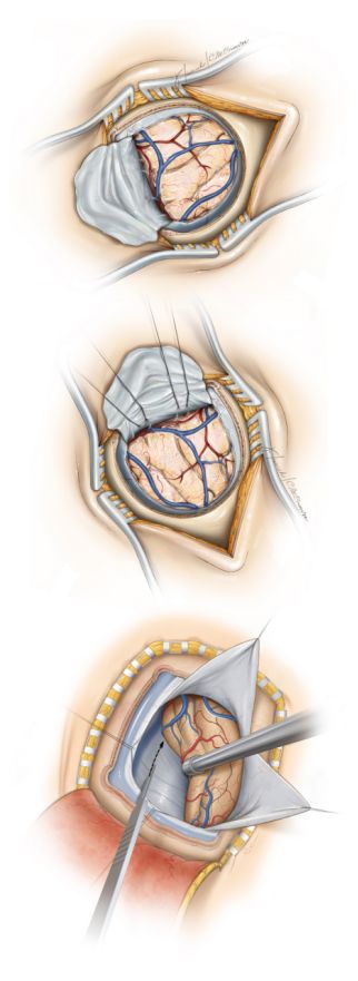幕上开颅时,水密缝合硬脑膜不是常规。应避免使用同种异体硬脑膜替代品,因为其有无菌性炎症或感染的风险。帽状腱膜下不放引流,头皮以标准的方式缝合。皮肤边缘仔细对合,避免使用可吸收缝合线绞窄缝合。