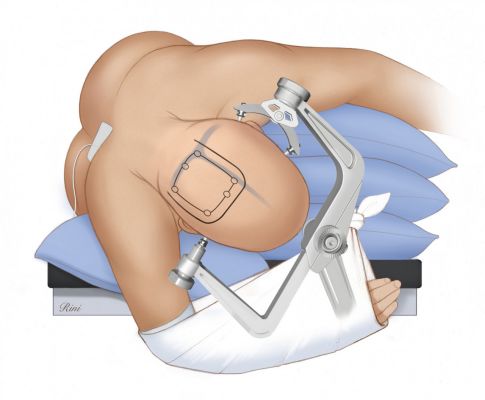 病人头部旋转或倾斜的程度取决于病变相对于中线和人字缝的确切位置。对于凸面病变,患者头部尽量倾斜使得病变位于手术区域最高点。对于枕部镰旁病变,应取患侧卧位,可利用重力的牵引作用以便暴露,再将头倾斜朝向地面,这样术者就能在更符合人体工程学的坐姿下进行显微手术。对侧腋窝放置腋垫支撑。将病人的同侧肩膀轻轻拉向前下方,用胶带固定,使其远离术者的操作区。