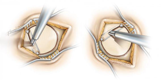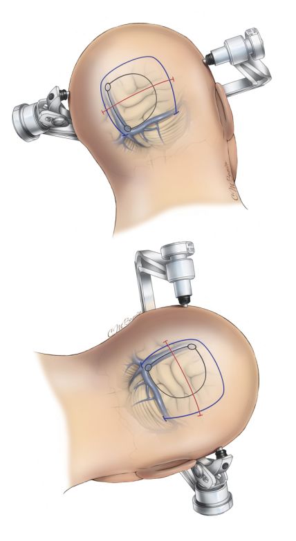图6. 对于凸面病变,根据神经导航对病变的定位,可于枕骨上钻一骨孔。对于旁正中或纵裂间病变(上面简图),可跨上矢状窦钻两个骨孔。术中尽早确定窦的位置可以帮助设计骨瓣的大小和位置。用3#Penfield剥离子分离颅骨内板和上矢状窦壁。通过腰大池引流使静脉窦壁和硬脑膜与颅骨分离,以避免被铣刀的护鞘损伤。如果窦壁与颅骨粘连紧密,在静脉窦上应该打第三个骨孔;所有的骨孔在硬膜外应该相对连续。最后铣开跨静脉窦的颅骨,以便静脉窦损伤、出血时能迅速去除骨瓣。
