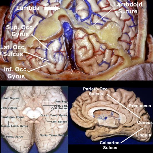 图1. 图示为枕叶的外侧面(上图),底面(左下图)和内侧面(右下图)。注意人字缝到枕叶前外侧界的密切关系。顶枕弓在顶枕沟上方。Inf.=下方; Lat.=外侧; Occ.=枕叶;Sup.=上方;Temp.=颞叶。(图片由AL Rhoton, Jr授权使用和修改).