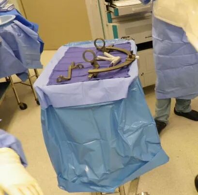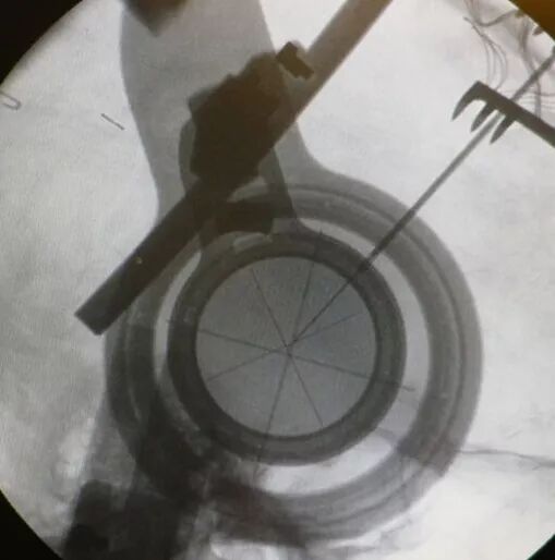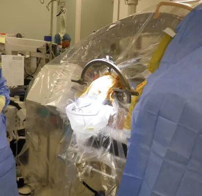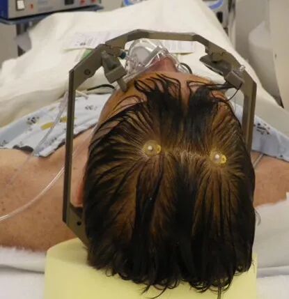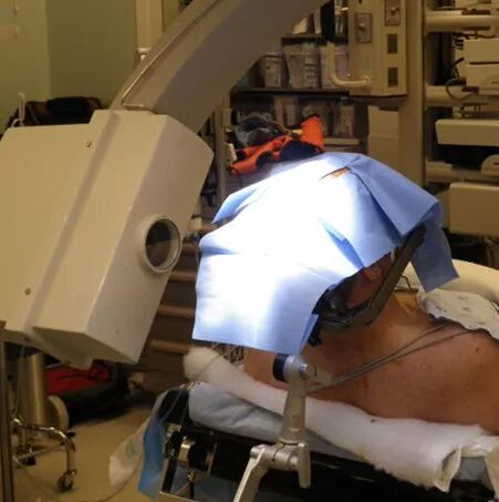 患者进入手术室后,消毒铺单,并安装立体定向Leksell头架。通过头架可以精确的把电极植入大脑的靶点位置。