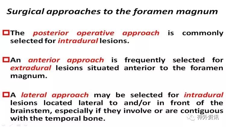 根据Rhoton教授显微神经解剖学,枕大孔区手术入路,可分为前方入路(Anterior approaches)、侧方入路(Lateral approaches)以及后方入路(Posterior approaches)。
