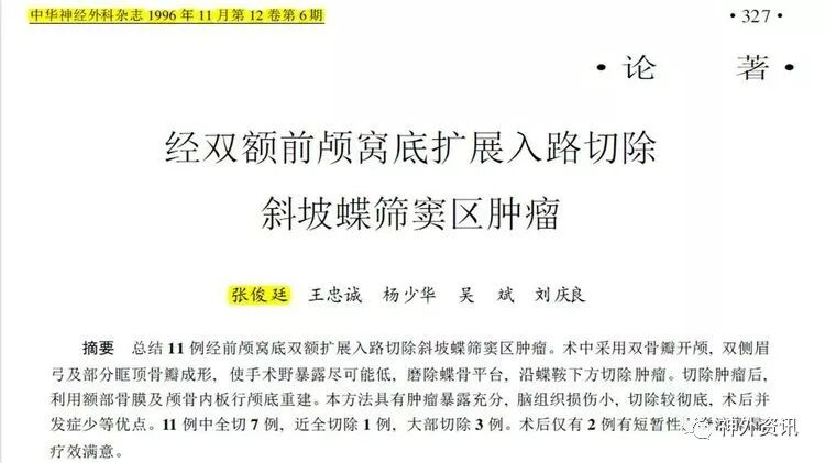我国颅底外科领军级专家,张俊廷教授,曾在1996年11月《中华神经外科杂志》撰文:经双额前颅底扩展入路切除斜坡蝶筛窦区肿瘤。