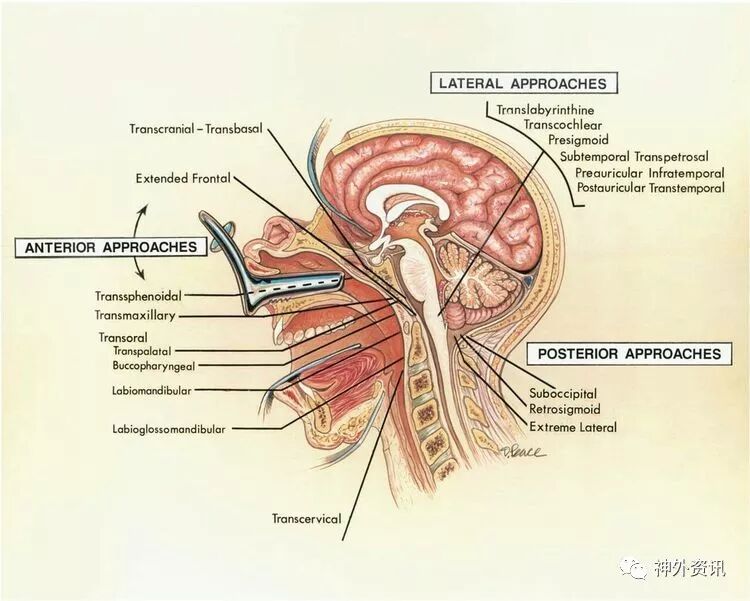 根据Rhoton教授:前方入路,首先应用于椎管前方病变的显露,后来才应用到脑干前方病变的显露。(The anterior approach was first used to reach lesions anterior to the spinal cord, and was subsequently used to expose lesions anterior to the brainstem.)