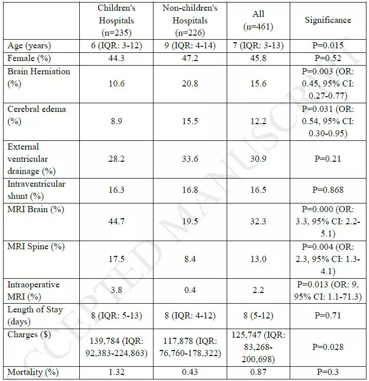 表1. 在儿童医院和非儿童医院接受治疗的小脑肿瘤患儿之间的情况差异。