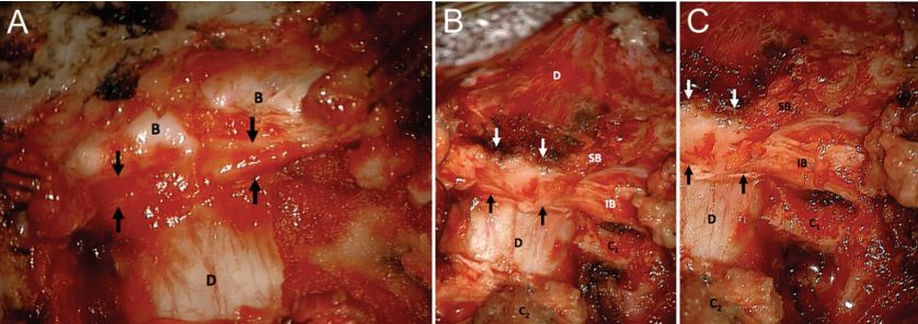 图1. 1例 Chiari畸形Ⅰ型患者,术中手术照片。A.黑色箭头所指为枕下韧带;B.切除枕骨后,枕下韧带完全暴露,箭头所示;C.枕下韧带放大观。