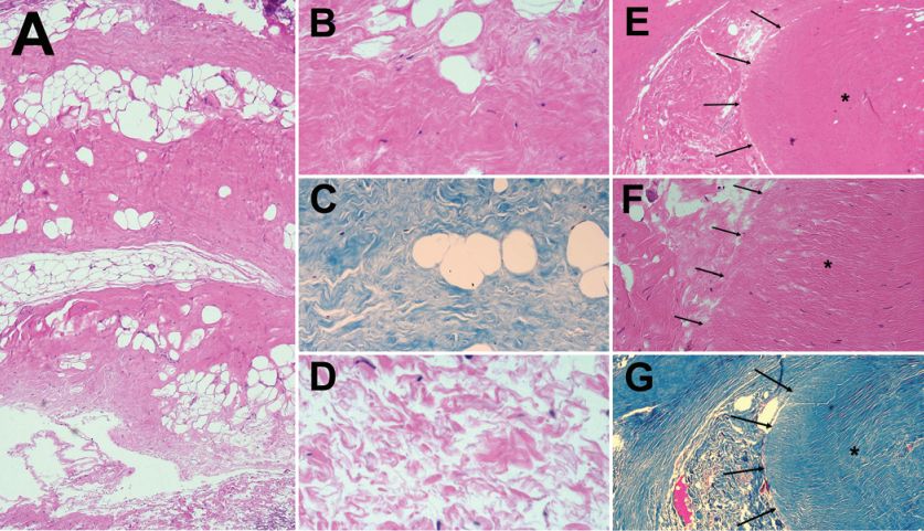 图4. CM-Ⅰ型患者枕下韧带的组织病理学切片图。A.HE染色,40×倍镜显示枕下韧带的结缔组织;B.HE染色,200×倍镜显示枕下韧带的结缔组织;C.Masson三色染色,200×倍镜显示结缔组织纤维走向变化;D.HE染色,400×倍镜显示结缔组织;E.HE染色,40×倍镜显示,星号表示玻璃样结节,箭头表示结节界面;F.HE染色,100×倍镜显示,星号表示玻璃样结节,箭头表示结节界面;G.Masson三色染色,40×倍镜显示玻璃样结节。