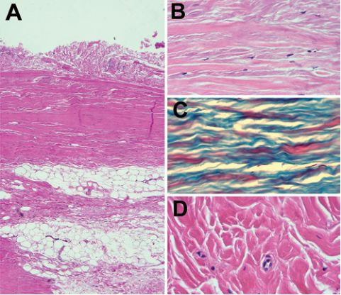 图3. 非CM-Ⅰ型的后颅窝脑膜瘤患者。A.HE染色,40×倍镜显示枕下韧带的结缔组织;B.HE染色,200×倍镜显示枕下韧带的结缔组织;C.Masson三色染色,200×倍镜显示纤维排列相互平行;D.HE染色,400×倍镜显示含毛细血管的结缔组织。
