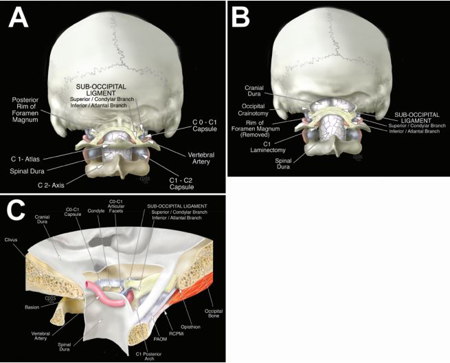 有一纤维状结构位于硬膜背侧、横向延伸在颅颈交界处双侧枕髁与C1寰椎上缘之间、而且部分覆盖枕骨常在后颅窝手术入路时连带枕骨大孔边缘被切除,该纤维结构称为枕下韧带(suboccipital ligament)(图1、2)。此结构外科医生虽然熟知,但其细节描述尚缺乏报道。美国田纳西大学健康科学中心医学院的Kelsey Alabaster等通过解剖和临床研究,对该结构进行详细阐述,结果发表于2018年1月的《J Neurosurg》上。