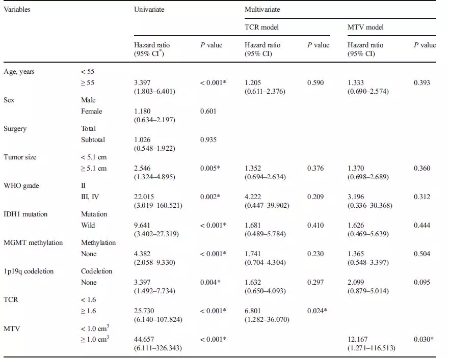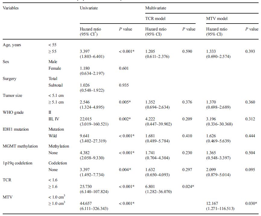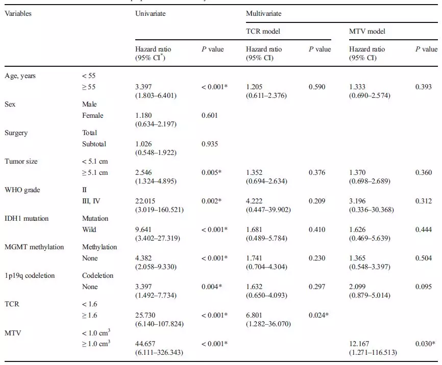 作者指出,通过11C-醋酸盐PET-CT测量得到的TCR,在低级别脑胶质瘤与高级别脑胶质瘤之间存在明显差异,具有鉴别III级与IV级脑胶质瘤的能力。TCR和MTV均是独立的预后因素,预测生存率的能力强于WHO肿瘤分级评分。