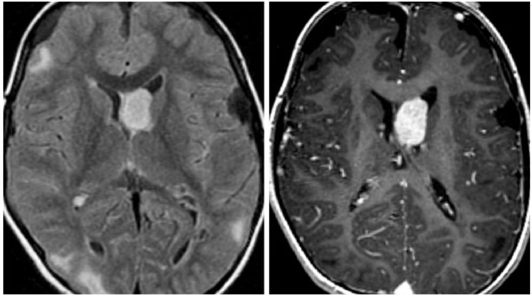 图1. 室管膜下巨细胞型星形细胞瘤(SEGA)的典型好发位置为室间孔附近,在结节性硬化症患者,肿瘤体积大于可见的室管膜下结节。左图:FLAIR相上可见多发的皮层下高信号团块影,位于脑室内室管膜下的肿瘤也呈高信号改变,其余的钙化室管膜下结节不明显;右图:T1增强加权像上可见典型的SEGA强化改变。