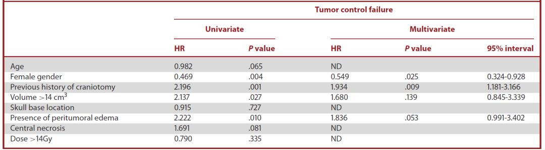 表1. GKRS治疗的肿瘤控制失败的多因素分析结果。