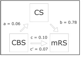 图1. 侧支循环评分介导血栓负荷评分与功能预后的关系。