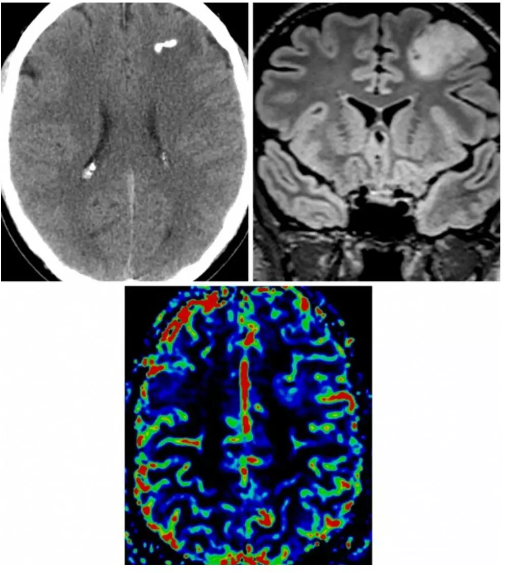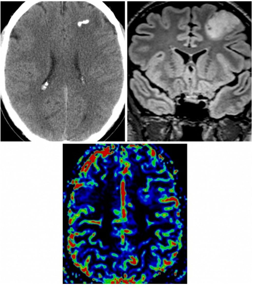 图1. 少突胶质细胞瘤在CT上的特征性改变为肿瘤内部的多发钙化(左上图);在冠状位FLAIR上,肿瘤典型的表现为均匀局限性浸润生长,累积周围的皮层及白质(右上图);在脑血容量灌注图像上,少突胶质细胞瘤表现为轻微低灌注,出现“鸡笼”样血管的病理特征(下图)。