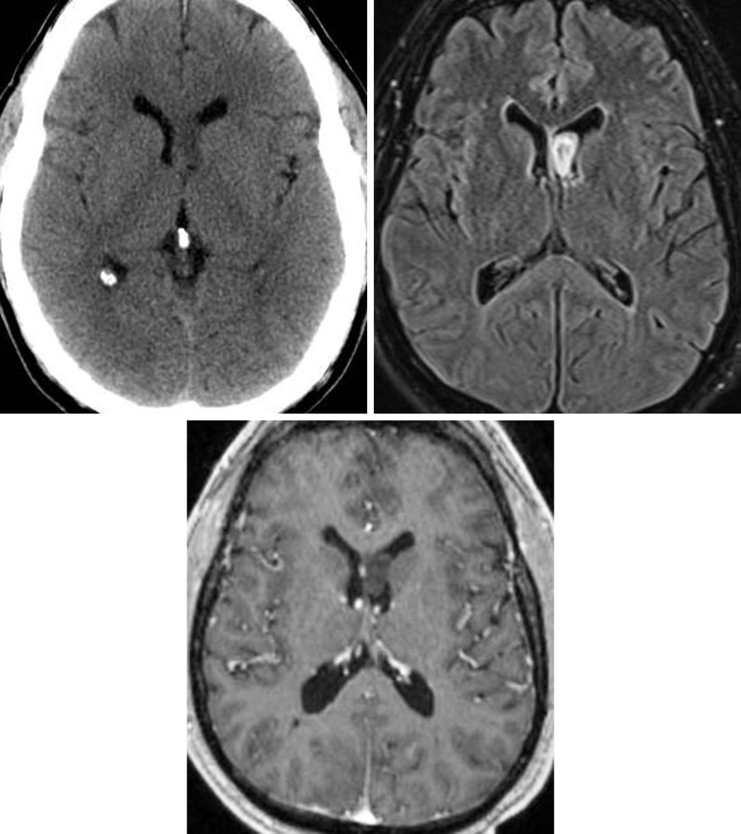 图2. 脑室内室管膜下瘤在CT上不易辨别(左上),而在FLAIR加权相上显示比较清楚(右上)。这例左侧脑室额角室管膜下瘤在T1增强加权相后未见明显强化效应(下)。