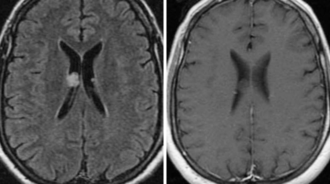 图1. 脑室内小结节状室管膜下瘤,在FLAIR加权相上呈高信号(左),是一种少见的良性肿瘤。增强后有多种表现,这例在T1增强加权相后无明显强化(右)。