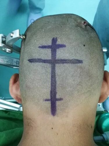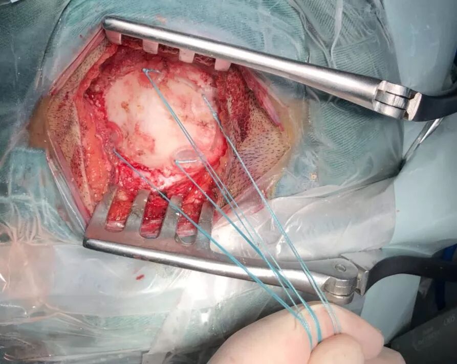 术毕回纳颅骨,使用蛇牌可吸收颅骨固定钉,适宜颅骨生长还未完成的小儿病患