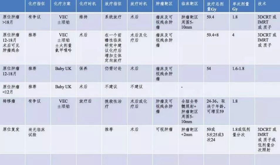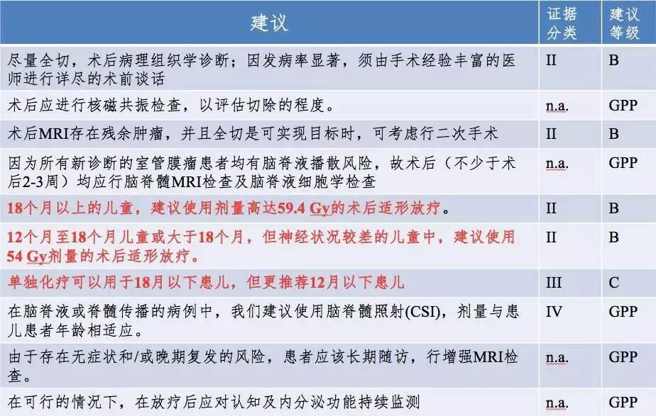 2017年EANO《指南》儿童新发颅内WHOII-III级室管膜肿瘤治疗建议