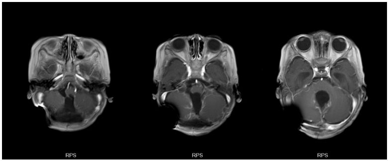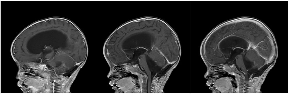 图4. 肿瘤切除术后,术区未见明显强化肿瘤残余,脑积水缓解。同时,由于使用蛇牌可吸收钉固定颅骨,成像无伪影,不影响术后检查。