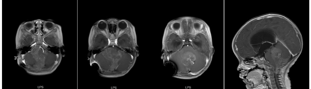 1月余前患儿无明显诱因下被发现头围较同龄儿偏大,并有进行性增大情况,无伴呕吐,无抽搐,无四肢活动障碍等情况,家属未重视未予就诊。1天前患儿开始出现步态不稳,不愿下地行走,精神偏软等,就诊于浙江大学医学院附属儿童医院神经内科,查头颅磁共振提示:“后颅窝占位,伴梗阻性脑积水”。请神经外科会诊后建议行手术治疗,拟“后颅窝占位,梗阻性脑积水”收住入院。