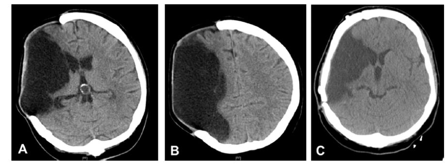 图1. A、B.女性患者,右大脑中动脉区脑梗死作右额颞去骨瓣减压术,术后5个月的CT成像;C.在腰大池脑脊液引流后完成颅骨成形术,术后1天的CT扫描结果。