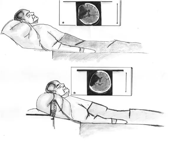 图2. 腰大池引流前、后的示意图。由于持续的脑脊液引流,颅骨缺损区膨出组织降低到正常位置,有利于进行颅骨成形手术。