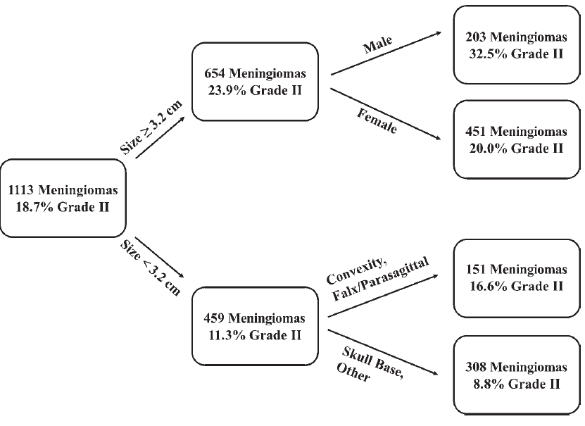 作者对1985年至2015年期间在其医院行脑膜瘤切除术的患者进行回顾性筛选,剔除信息不完全、脊膜瘤、多发性脑膜瘤或Ⅲ级脑膜瘤患者。肿瘤大小用肿瘤最大径表示。采用单变量和多变量logistic回归模型分析肿瘤大小与肿瘤WHO分级的关系。通过脑肿瘤独立递归分级分析,以确定WHO Ⅱ级的非典型脑膜瘤高危人群。