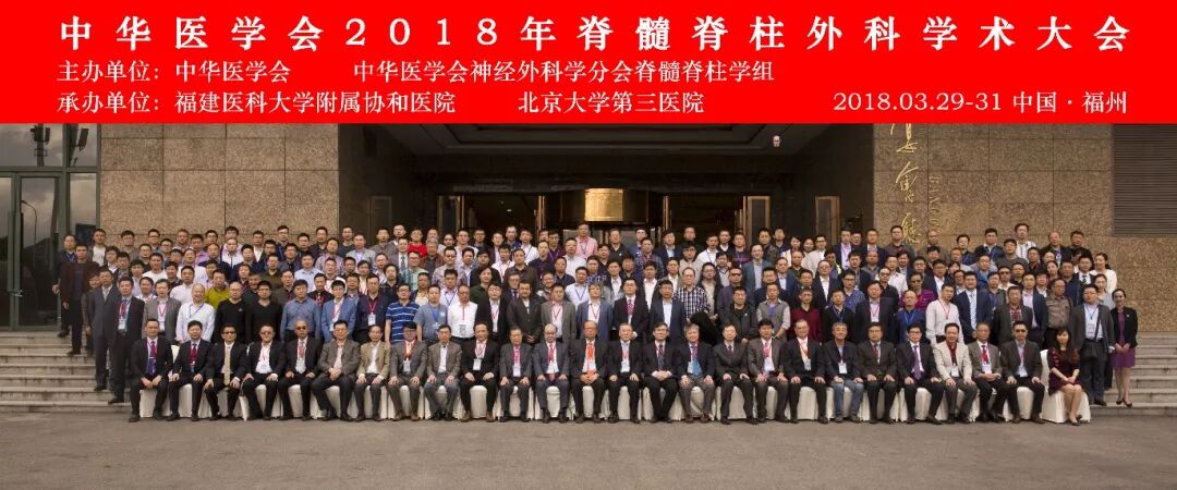 由中华医学会与中华医学会神经外科学分会脊髓脊柱学组主办,福建医科大学附属协和医院、北京大学第三医院承办的中华医学会2018年脊髓脊柱外科学术大会于2018年3月29-31日在福州召开,本次会议投稿306篇,不仅投稿数量创历届最多并且涵盖神经外科、骨科、放射影像科、康复科等多学科。127位来自美国、日本及海峡两岸的脊髓脊柱外科专家登台演讲,参会者约500余人。