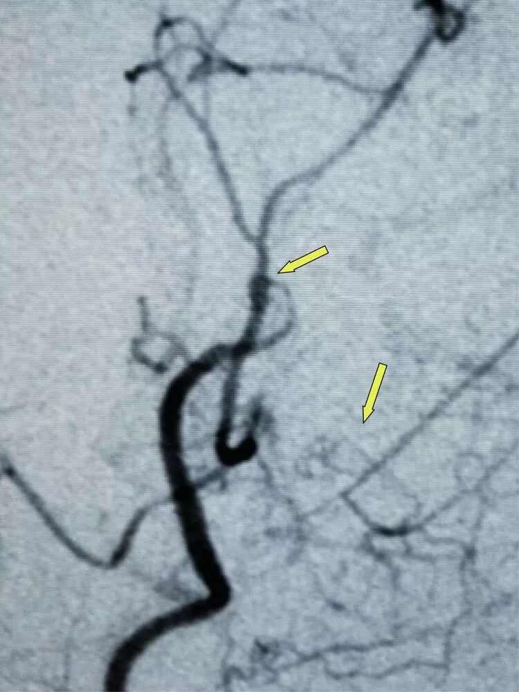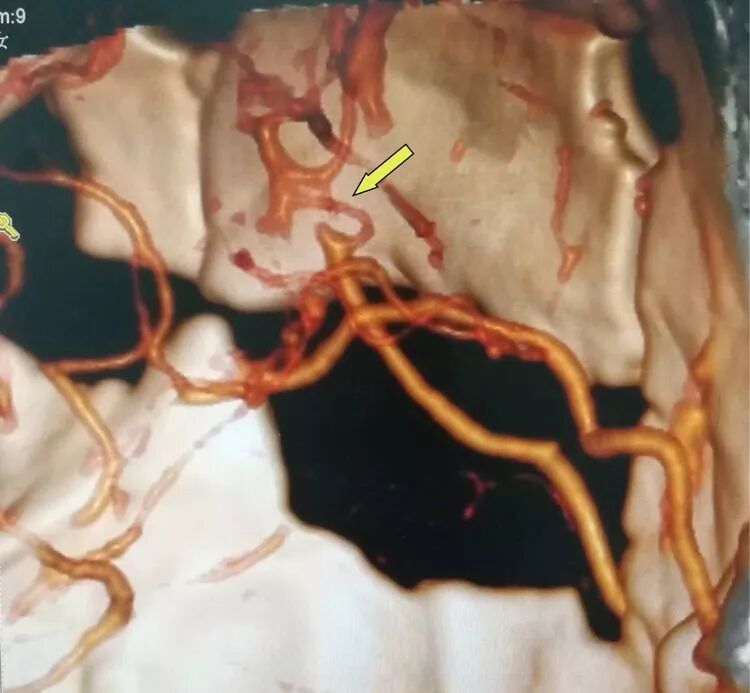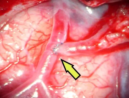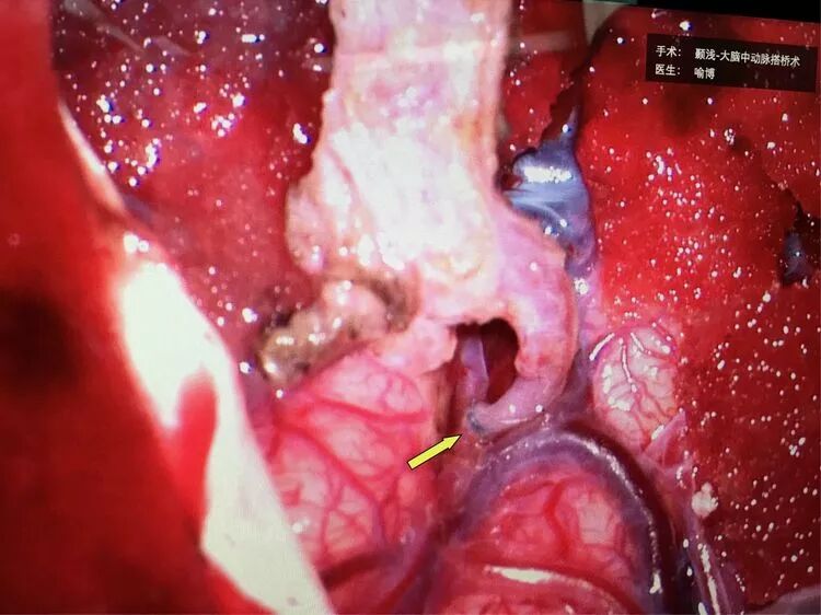 箭头所示为颞浅动脉额支(供血动脉)与右侧大脑中动脉M4段(受体)经精密的缝合吻合到一起(血管直径只有0.8mm)。