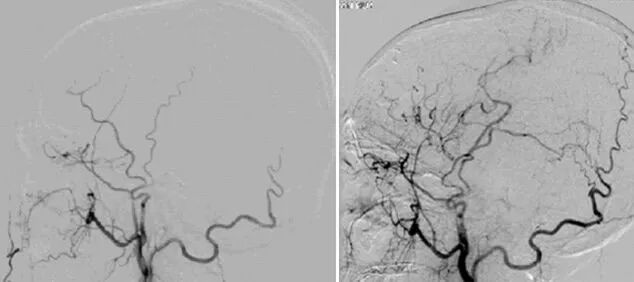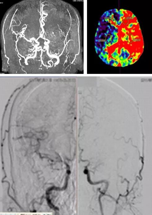 术前(左侧)与术后(右侧)左侧大脑半球供血血流的对比,术后患侧大脑半球血运很大程度增多。