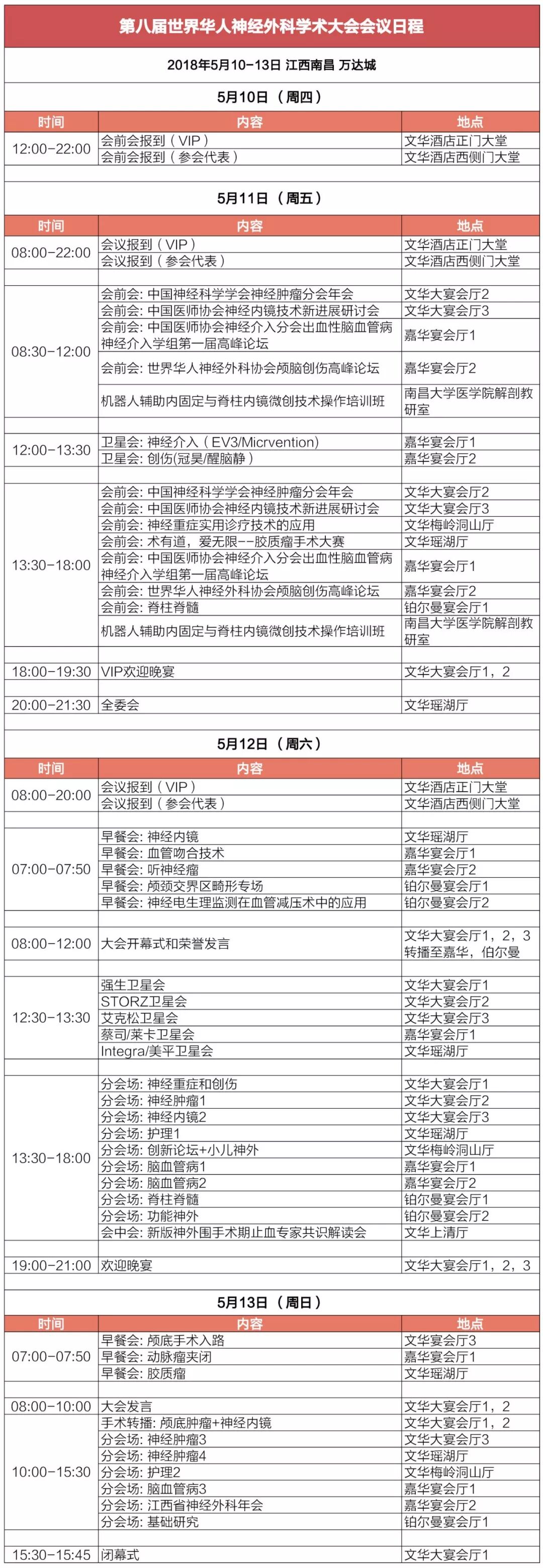 2018年5月10日至13日,第八届世界华人神经外科学术大会将在江西南昌拉开帷幕,我们计日以俟。