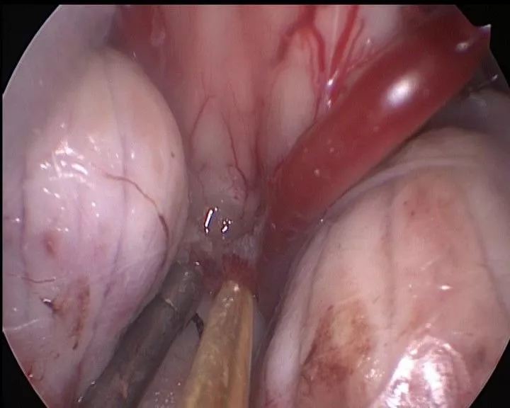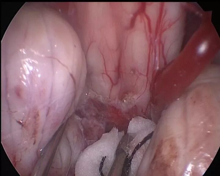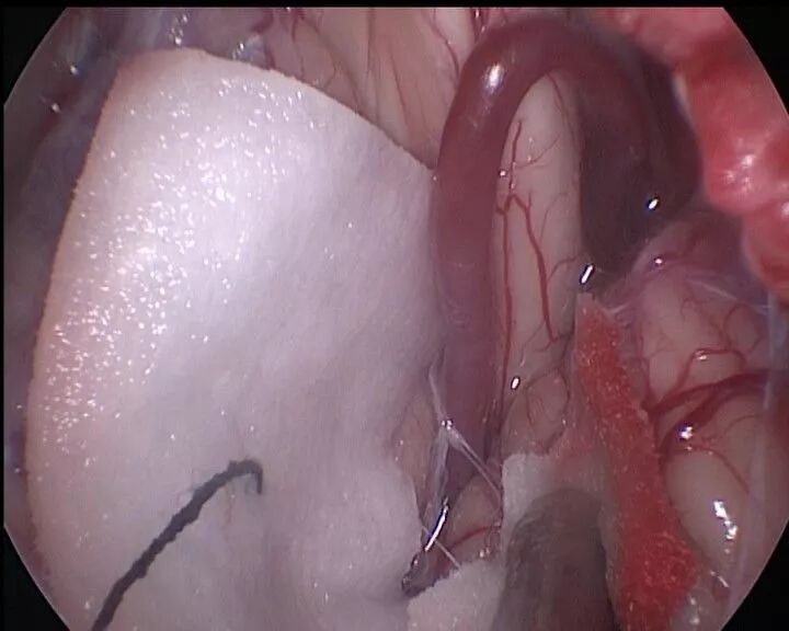 明胶海绵放入正中孔,分隔脑干和脉络膜