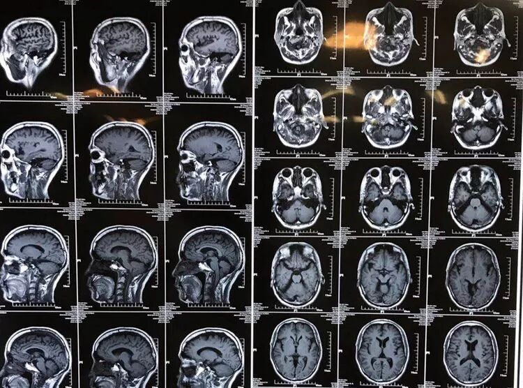 入院查体:双侧瞳孔等大等圆,直径3.5mm,直接对光反射双侧灵敏,间接对光反射双侧灵敏。右颞顶枕部皮肤浅感觉减退,右侧躯体及右侧肢体皮肤浅感觉减退。左侧肢体肌力5级。右侧肢体肌力4级。右侧踝阵挛阳性。双侧Babinski征(+)。