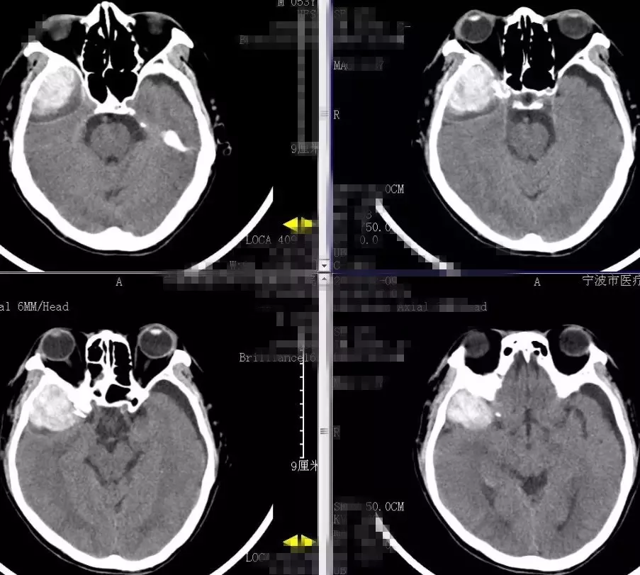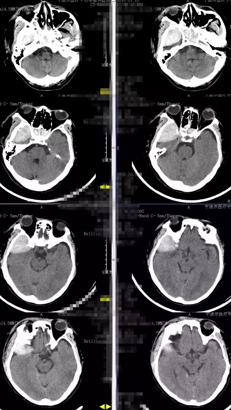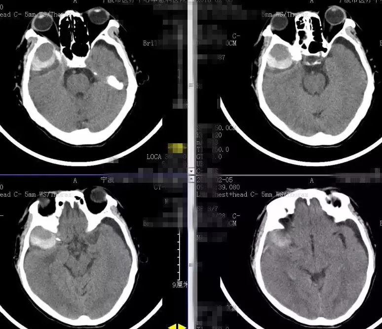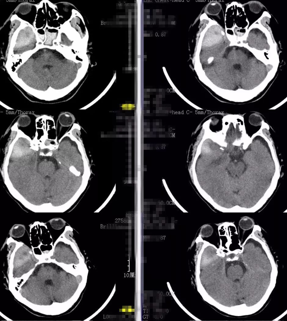 图5. 2018-2-9 CT提示右颞硬膜外血肿较前明显增多。