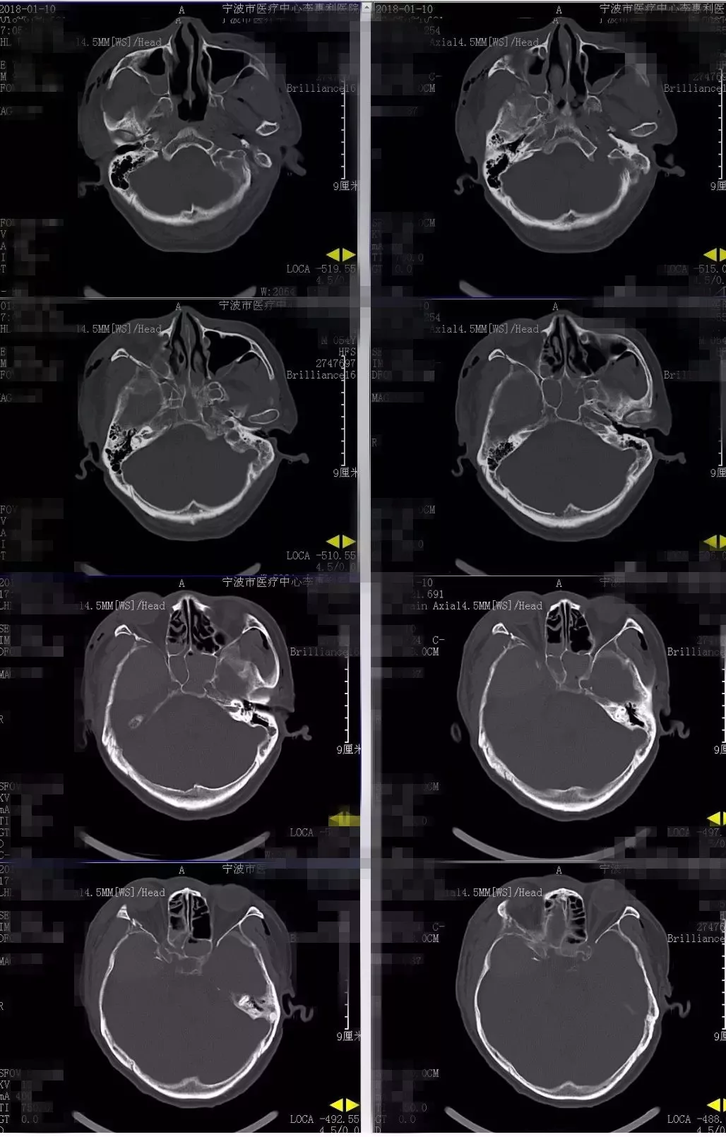 患者1天前骑电瓶车被卡车撞倒受伤,伤后右侧头面部出血,右上肢活动障碍,右眼视力下降。送至当地医院检查后诊断:“右颞硬膜外血肿,颅底骨折,颞骨骨折,右侧视神经损伤,右侧气胸伴多发肋骨骨折,右肱骨骨折等”,给予右侧胸腔闭式引流,右肱骨石膏固定。为进一步治疗转来宁波市李惠利医院神经外科。