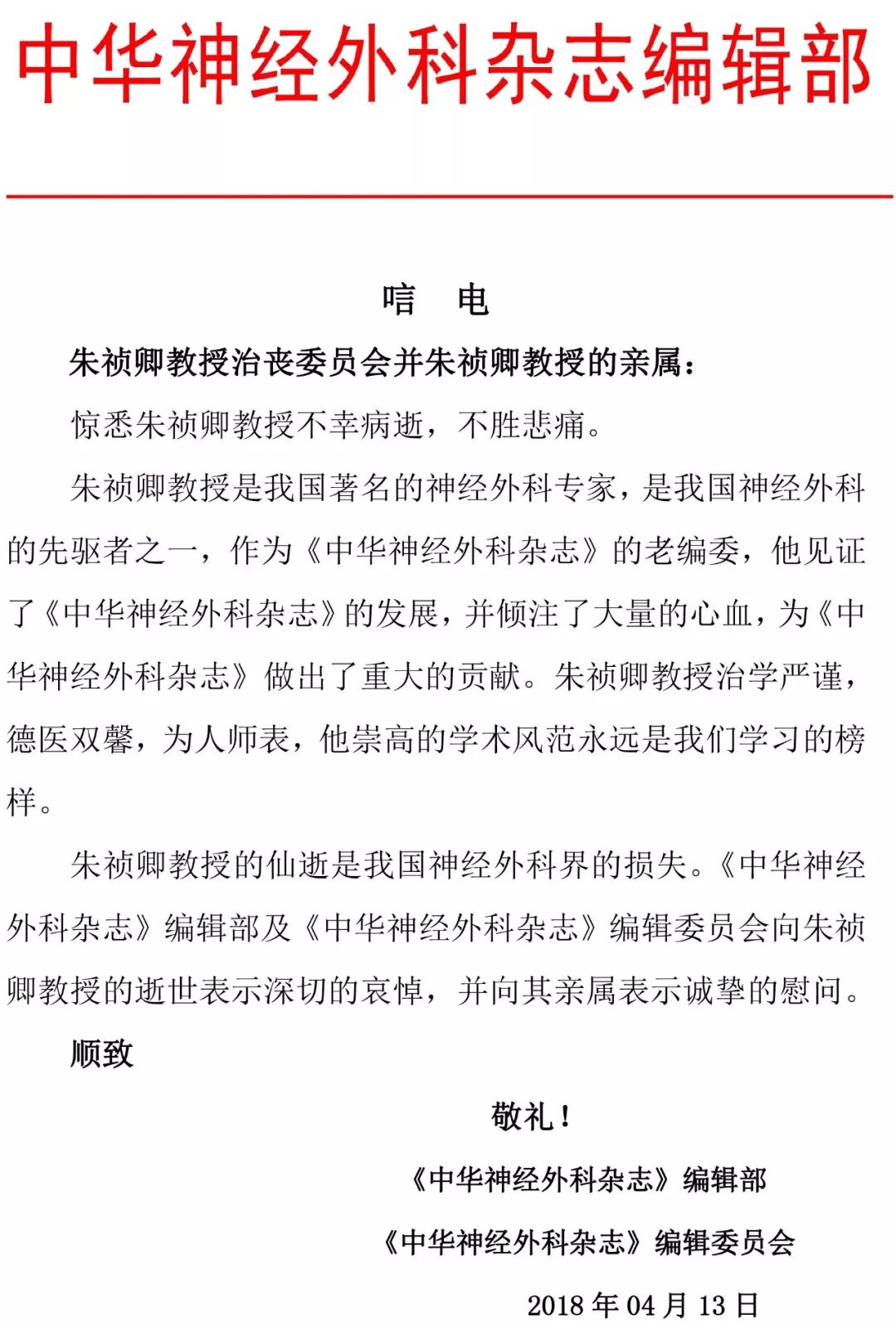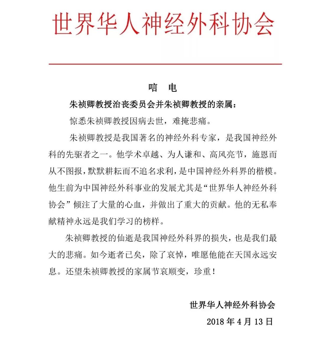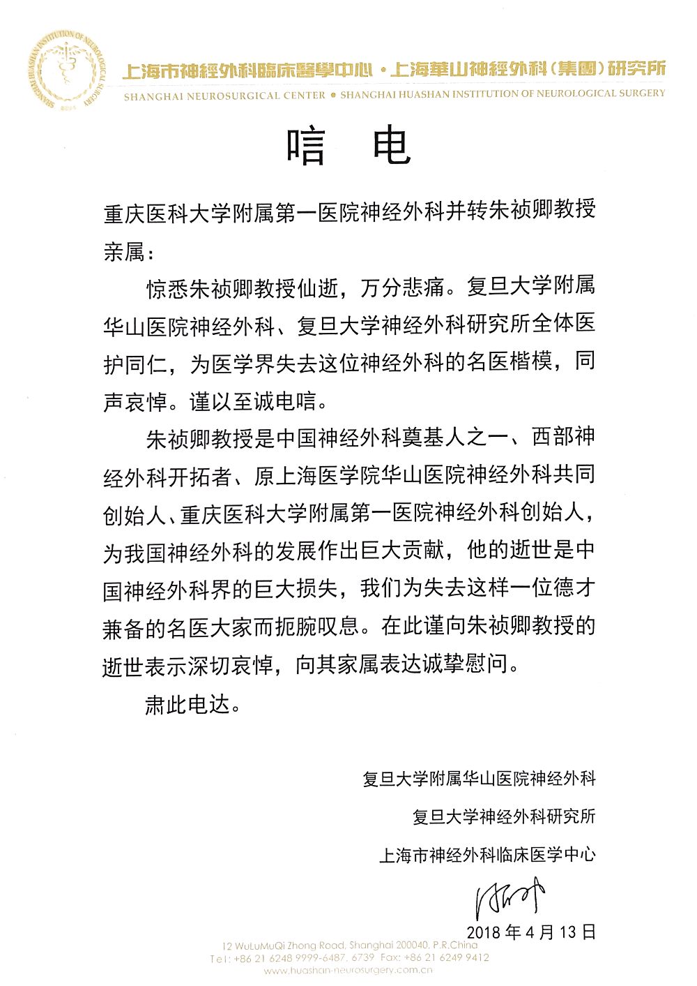 讣 告 我国著名的神经外科专家、重庆医科大学附属第一医院神经外科创始人、原主任朱祯卿教授(1958年12月由上海第一医学院华山医院调来支援重庆医学院建设),因病医治无效,于2018年4月11日晚22时在美国明州圣保罗市不幸逝世,享年99岁。朱祯卿教授1919年12月生于江苏省金山县,1945年7月毕业于国立上海医学院。1945年8月至1958年12月,上海第一医学院华山医院工作,任医师、主治医师;1958年12月至1987年9月,重庆医学院第一附属医院工作,任副教授、教授、科主任,获重庆医科大学突出贡献奖,1987年9月退休。朱祯卿同志的逝世,是我国医学事业的重大损失;也是重庆医科大学、重庆医科大学附属第一医院的重大损失。对朱祯卿同志的逝世,我们表示深切哀悼。朱祯卿同志国内生前好友、同事可致电其家属悼念。家属联系方式:朱伟曦电话:001(651)242-0313邮箱:denniszhu@yahoo.com重庆医科大学附属第一医院2018年4月13日朱祯卿教授生平简介朱桢卿教授生于1919年12月,江苏金山县人。1945年毕业于国立上海医学院;毕业后分配至上海第一医学院华山医院普外科工作,历任住院医师、主治医师、讲师、副教授。1958年积极响应党中央的号召,从繁华的大都市上海来到山城重庆,参与重庆医科大学(原重庆医学院)和重庆医科大学附属医院的建设工作,担任重医一院神经外科主任, 1978年2月晋升为教授,于1987年09月退休。朱祯卿教授是中国神经外科创始人之一。解放后不久原上海医学院领导决定“把神经内科医生的脑和普外科医生的手结合起来,创建中国自己的神经外科”。1952年,在黄家驷教授、沈克非教授的支持下, 朱祯卿和史玉泉两位年轻的普外科主治医生在华山医院开展开颅手术,神经内科的张沅昌教授协助做病灶定位,由此华山医院神经外科正式创建,天津总医院和华山医院成为国内最早单独设立神经外科的两个医学机构。朱祯卿和史玉泉医生共同成为中国神经外科发展的奠基人和开拓者之一,他们二人都是当年上医最优秀的总住院医师。1956年,朱祯卿和史玉泉医生晋升为副教授。1958年,朱祯卿教授来到重庆,创建了西南地区第一个神经外科——重庆医学院附属第一医院神经外科,为中国西南地区神经外科的发展做出了卓越贡献。上世纪70-80年代参加全国会议,朱祯卿教授(前排右4)与史玉泉教授(前排右5)、薛庆澄教授(前排右6)并排而坐。朱祯卿教授一生治学严谨,不断攀登医学高峰,成果丰硕。他先后荣获上海第一医学院华山医院先进工作者、重庆医科大学附属第一医院先进工作者、重庆医科大学突出贡献奖等多项荣誉称号。 他在上世纪70年代初期就着手开展颅内动脉瘤的直接手术治疗,使重医附一院成为国内最早开展该项手术的医院之一。他先后发表《颅内动脉瘤的外科治疗》(新医学,1978年)、《100例脑动脉瘤的直接手术》(脑电图学与神经精神疾病杂志,1986)等多篇论文。“颅内动脉瘤的外科治疗” 先后获得重庆市科学大会奖(1978)及四川省科技进步奖三等奖(1984)。他在70年代后期指导唐文渊医师开展了经股动脉、股静脉插管脑血管或脊髓血管造影术,在CT问世前为提高神经外科疾病的诊断率发挥了重要作用,当时在国内处于领先地位。先后发表《经股动脉穿刺插管行椎动脉造影术85例分析》(重庆医学院学报,1980)、《经股静脉插管的海绵窦和海绵间窦造影术》(中华医学杂志,1985)、《经股动脉插管椎动脉造影304例分析》(中华神经外科杂志,1985)、《经股静脉插管腰硬脊膜外静脉造影术》(中华外科杂志,1985)等10余篇论文,在国内引起了极大反响。“经股动脉穿刺插管行椎动脉造影术”获得重庆市重大科技成果四等奖(1979),“经股静脉插管腰硬脊膜外静脉造影术的研究”获得四川省医药卫生优秀成果四等奖(1984)和卫生部乙级成果奖(1985)。先后举办了4期全国性的脑血管造影学习班,前后共有100余名来自全国各地神经外科医师参加,为全国随后血管内介入治疗的开展做出了重要贡献。他先后参加编写全国统编教材《外科学》、以及《外科学、手术学》、《医学百科全书》等多部专著。发表医学论文数十篇。他潜心教学和人才培养。为四川、云南、贵州、广西、内蒙、湖南、湖北等许多医院培养了第一代的神经外科医生和一大批神经外科骨干,桃李满天下,为神经外科专业在西南地区乃至全国的开展和推广作出了重大贡献。朱祯卿教授不但是学术大师,更是品德高尚的楷模和典范。他为人谦虚、待人友善。他时刻牢记“救死扶伤”的神圣职责,不图名利,勇于实践,不断探索,对技术精益求精,把解除患者的痛苦看作是自己最高的追求。行医五十多年来,无论是春夏秋冬,还是白天黑夜,只要是患者的需要,他都有求必应,凭借高超的医术和丰富的临床经验,医治了无数患者;他待人和蔼可亲,乐善好施,始终把病人当亲人,以高尚的医德和精良的医术赢得了广大群众的赞誉。朱老的一生是丰富的一生,是奉献的一生,是令人感佩的一生!朱老的逝世,是我国医学事业的重大损失,也是重庆医科大学、重庆医科大学附属第一医院的重大损失,他虽然离开了我们,但他高尚的品质和崇高的思想永远活在我们每个人的心中,我们一定会化悲痛为力量,学习他视病人如亲人、献身医学事业的精神。我们要继承他的遗愿,坚持继承发扬,努力拼搏,积极完成我们的各项工作,为发扬朱老的学术思想而