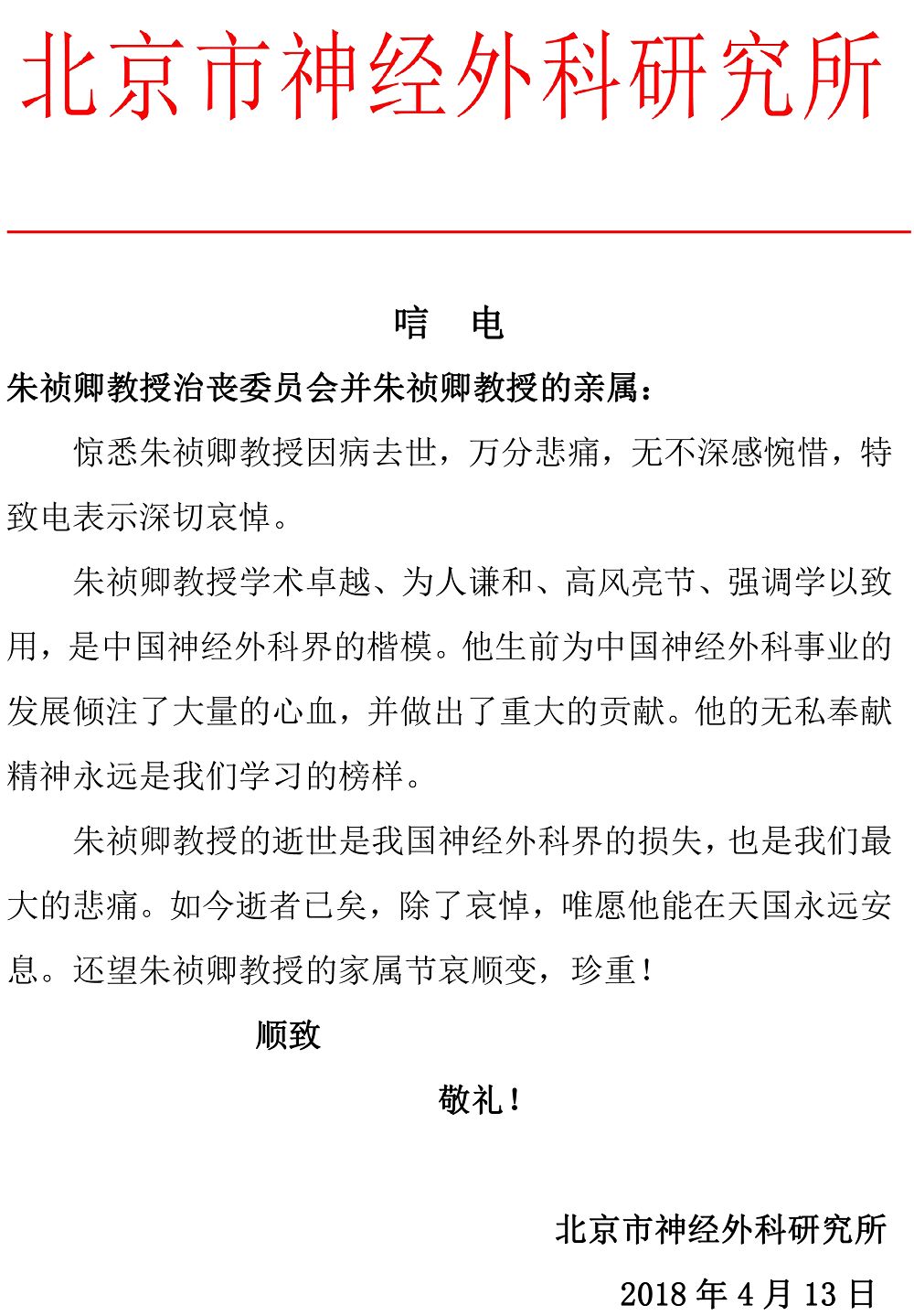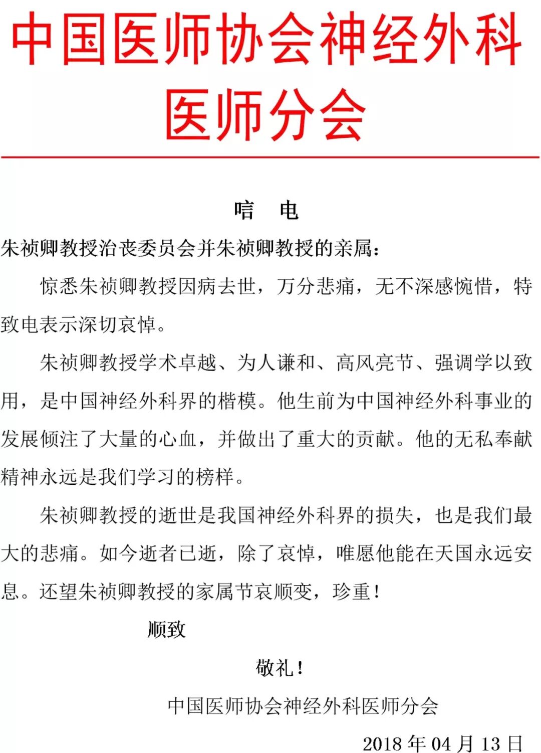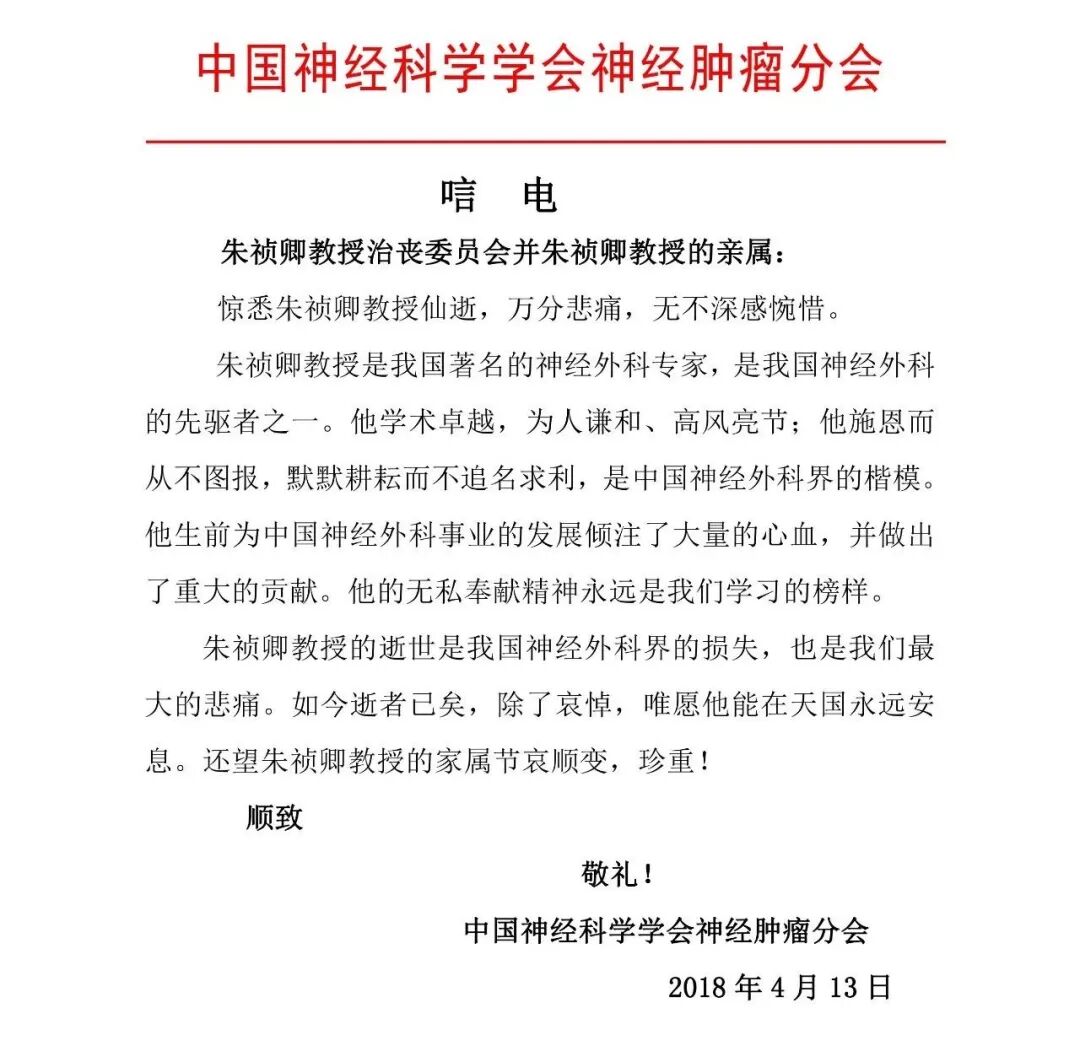 讣 告 我国著名的神经外科专家、重庆医科大学附属第一医院神经外科创始人、原主任朱祯卿教授(1958年12月由上海第一医学院华山医院调来支援重庆医学院建设),因病医治无效,于2018年4月11日晚22时在美国明州圣保罗市不幸逝世,享年99岁。朱祯卿教授1919年12月生于江苏省金山县,1945年7月毕业于国立上海医学院。1945年8月至1958年12月,上海第一医学院华山医院工作,任医师、主治医师;1958年12月至1987年9月,重庆医学院第一附属医院工作,任副教授、教授、科主任,获重庆医科大学突出贡献奖,1987年9月退休。朱祯卿同志的逝世,是我国医学事业的重大损失;也是重庆医科大学、重庆医科大学附属第一医院的重大损失。对朱祯卿同志的逝世,我们表示深切哀悼。朱祯卿同志国内生前好友、同事可致电其家属悼念。家属联系方式:朱伟曦电话:001(651)242-0313邮箱:denniszhu@yahoo.com重庆医科大学附属第一医院2018年4月13日朱祯卿教授生平简介朱桢卿教授生于1919年12月,江苏金山县人。1945年毕业于国立上海医学院;毕业后分配至上海第一医学院华山医院普外科工作,历任住院医师、主治医师、讲师、副教授。1958年积极响应党中央的号召,从繁华的大都市上海来到山城重庆,参与重庆医科大学(原重庆医学院)和重庆医科大学附属医院的建设工作,担任重医一院神经外科主任, 1978年2月晋升为教授,于1987年09月退休。朱祯卿教授是中国神经外科创始人之一。解放后不久原上海医学院领导决定“把神经内科医生的脑和普外科医生的手结合起来,创建中国自己的神经外科”。1952年,在黄家驷教授、沈克非教授的支持下, 朱祯卿和史玉泉两位年轻的普外科主治医生在华山医院开展开颅手术,神经内科的张沅昌教授协助做病灶定位,由此华山医院神经外科正式创建,天津总医院和华山医院成为国内最早单独设立神经外科的两个医学机构。朱祯卿和史玉泉医生共同成为中国神经外科发展的奠基人和开拓者之一,他们二人都是当年上医最优秀的总住院医师。1956年,朱祯卿和史玉泉医生晋升为副教授。1958年,朱祯卿教授来到重庆,创建了西南地区第一个神经外科——重庆医学院附属第一医院神经外科,为中国西南地区神经外科的发展做出了卓越贡献。上世纪70-80年代参加全国会议,朱祯卿教授(前排右4)与史玉泉教授(前排右5)、薛庆澄教授(前排右6)并排而坐。朱祯卿教授一生治学严谨,不断攀登医学高峰,成果丰硕。他先后荣获上海第一医学院华山医院先进工作者、重庆医科大学附属第一医院先进工作者、重庆医科大学突出贡献奖等多项荣誉称号。 他在上世纪70年代初期就着手开展颅内动脉瘤的直接手术治疗,使重医附一院成为国内最早开展该项手术的医院之一。他先后发表《颅内动脉瘤的外科治疗》(新医学,1978年)、《100例脑动脉瘤的直接手术》(脑电图学与神经精神疾病杂志,1986)等多篇论文。“颅内动脉瘤的外科治疗” 先后获得重庆市科学大会奖(1978)及四川省科技进步奖三等奖(1984)。他在70年代后期指导唐文渊医师开展了经股动脉、股静脉插管脑血管或脊髓血管造影术,在CT问世前为提高神经外科疾病的诊断率发挥了重要作用,当时在国内处于领先地位。先后发表《经股动脉穿刺插管行椎动脉造影术85例分析》(重庆医学院学报,1980)、《经股静脉插管的海绵窦和海绵间窦造影术》(中华医学杂志,1985)、《经股动脉插管椎动脉造影304例分析》(中华神经外科杂志,1985)、《经股静脉插管腰硬脊膜外静脉造影术》(中华外科杂志,1985)等10余篇论文,在国内引起了极大反响。“经股动脉穿刺插管行椎动脉造影术”获得重庆市重大科技成果四等奖(1979),“经股静脉插管腰硬脊膜外静脉造影术的研究”获得四川省医药卫生优秀成果四等奖(1984)和卫生部乙级成果奖(1985)。先后举办了4期全国性的脑血管造影学习班,前后共有100余名来自全国各地神经外科医师参加,为全国随后血管内介入治疗的开展做出了重要贡献。他先后参加编写全国统编教材《外科学》、以及《外科学、手术学》、《医学百科全书》等多部专著。发表医学论文数十篇。他潜心教学和人才培养。为四川、云南、贵州、广西、内蒙、湖南、湖北等许多医院培养了第一代的神经外科医生和一大批神经外科骨干,桃李满天下,为神经外科专业在西南地区乃至全国的开展和推广作出了重大贡献。朱祯卿教授不但是学术大师,更是品德高尚的楷模和典范。他为人谦虚、待人友善。他时刻牢记“救死扶伤”的神圣职责,不图名利,勇于实践,不断探索,对技术精益求精,把解除患者的痛苦看作是自己最高的追求。行医五十多年来,无论是春夏秋冬,还是白天黑夜,只要是患者的需要,他都有求必应,凭借高超的医术和丰富的临床经验,医治了无数患者;他待人和蔼可亲,乐善好施,始终把病人当亲人,以高尚的医德和精良的医术赢得了广大群众的赞誉。朱老的一生是丰富的一生,是奉献的一生,是令人感佩的一生!朱老的逝世,是我国医学事业的重大损失,也是重庆医科大学、重庆医科大学附属第一医院的重大损失,他虽然离开了我们,但他高尚的品质和崇高的思想永远活在我们每个人的心中,我们一定会化悲痛为力量,学习他视病人如亲人、献身医学事业的精神。我们要继承他的遗愿,坚持继承发扬,努力拼搏,积极完成我们的各项工作,为发扬朱老的学术思想而