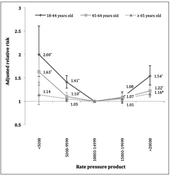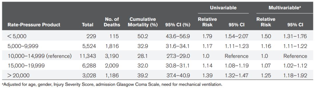 该研究回顾2007年至2014年间登记在美国国家创伤数据库的26412例sTBI患者资料,患者入院时GCS评分<8分,头部AIS评分≥4分。将患者心率×收缩压的乘积(rate-pressure product,RPP)分为5个级别:<5000,5000~9999,10000~14999,15000~19999,以及>20000。以10000~14999为RPR正常范围。