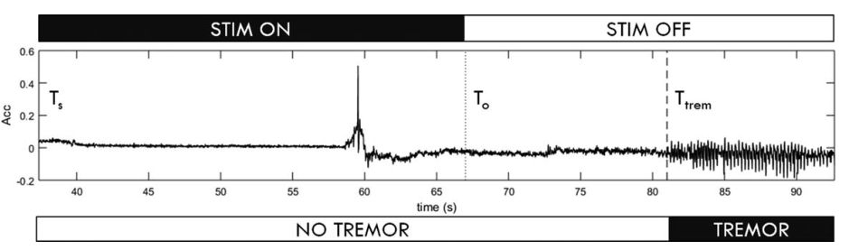 STIM ON:刺激期;STIM OFF:刺激间歇期;Acc:加速度感测器记录结果;Ts:电刺激启动时间点;To:电刺激关闭时间点;Ttrem:震颤发作时间点。Acc波形第59s处记录到的峰值,为令患者向前伸出手臂和手掌的时间点。