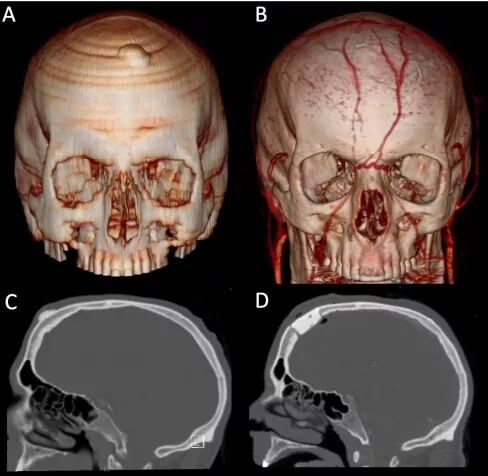 图1. 术前CT和3D重建及骨瘤切除后原位颅骨修补。A.术前CT-3D重建显示,中线偏左一颅骨表面突出肿块;B.骨质肿块切除,颅骨原位修补成形后的3D重建;C.颅脑CT矢状位骨窗成像显示,病变位于颅骨中线;D.CT矢状位骨窗成像显示,颅骨缺损处已快速修补成形。