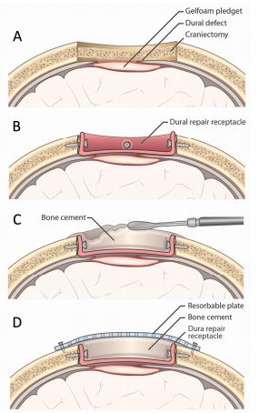 图3. 术中颅骨缺损原位修补术示意图。A.切除病变的颅骨;B.将硬膜修补片形成容纳骨质替代物的贮器;C.骨水泥充填和颅骨修补成形;D.采用可吸收接骨板固定。