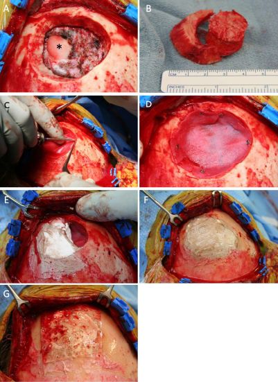 图2. 颅骨病灶切除和术中原位颅骨修补。A.切除骨瘤,见硬膜受累;B.切除的骨质呈圆形;C、D.把人工硬膜补片置于颅骨缺损处,形成可容纳颅骨修补材料的贮器;E、F.用羟基磷灰石骨水泥颅骨充填缺损处,轮廓与缺损处一致;G.将可吸收接骨板置于凝固的骨水泥表面,固定之。