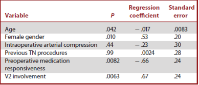 患者平均随访42.4个月。结果显示,60岁以上高龄患者术后的BNI疼痛评分和改良BNI疼痛评分明显优于60岁以下患者(P=0.035,P=0.0084);两年龄组患者疼痛缓解率分别为83.3%和57.3%。通过单因素分析发现,年龄越大(P=0.0043),术后疼痛减轻越明显。此外,男性(P=0.016)、术前对药物反应好(P=0.0053)等因素也和术后疼痛缓解程度相关。但三叉神经V2支受血管压迫的患者,术后疼痛评分仍然较高(P=0.043)。多元回归分析与单因素分析结果一致(表2)。