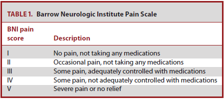 作者收集该医疗中心在2004年至2014年期间行MVD的124例TN患者资料。根据患者年龄分成两组,<60岁组82例和≥60岁组42例。手术疗效按巴罗神经病学研究所(Barrow Neurologic Institute,BNI)疼痛评分和改良BNI疼痛评分评估,并进行单因素和多元回归等统计方法分析。BNI疼痛评分为,Ⅰ级:无痛,不需服药;Ⅱ级:偶尔痛,不需服药;Ⅲ级:轻度疼痛,可用药物控制;Ⅳ级:轻度疼痛,无法用药物缓解;Ⅴ级:重度疼痛或疼痛未缓解(表1)。