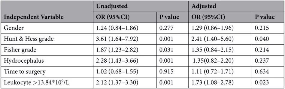 表1. 脑动脉瘤破裂出血不良预后多变量分析结果。