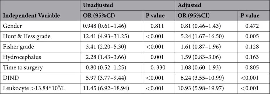 表2. 脑动脉瘤破裂出血出现DIND多变量分析结果。