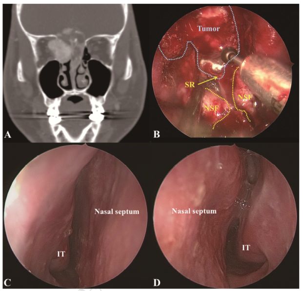 图2. 病例2.内镜下经鼻建立双侧鼻中隔皮瓣切除骨化纤维瘤。(A)术前副鼻窦CT冠状位成像;(B)术中照片;(C)右鼻腔和(D)左鼻腔。SR:蝶嘴;NSP:鼻中隔皮瓣;IT:下鼻甲。